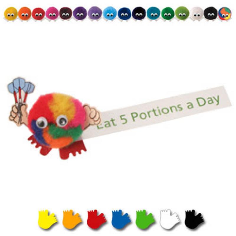 Logobug holding a brochure which can be printed with your details Ribbon attachment printed in full colour Large range of 44 pom pom colours and 7 different feet colours to choose from